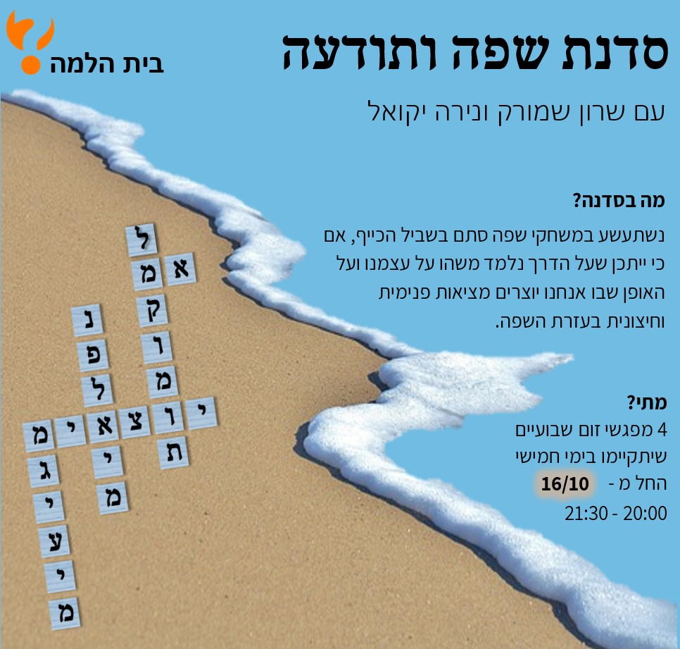 16/10/2025 | חמישי | 20:00 - 21:30 | סדרה של 4 מפגש זום "סדנת שפה ותודעה" - עם שרון שמורק ונירה יקואל |