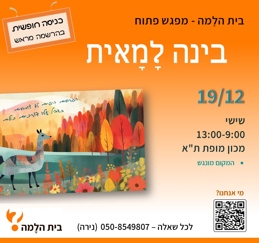 19/12/25 | שישי | 9:00 - 13:00 | מפגש פתוח "בינה למאית" - מכון מופת ת"א |